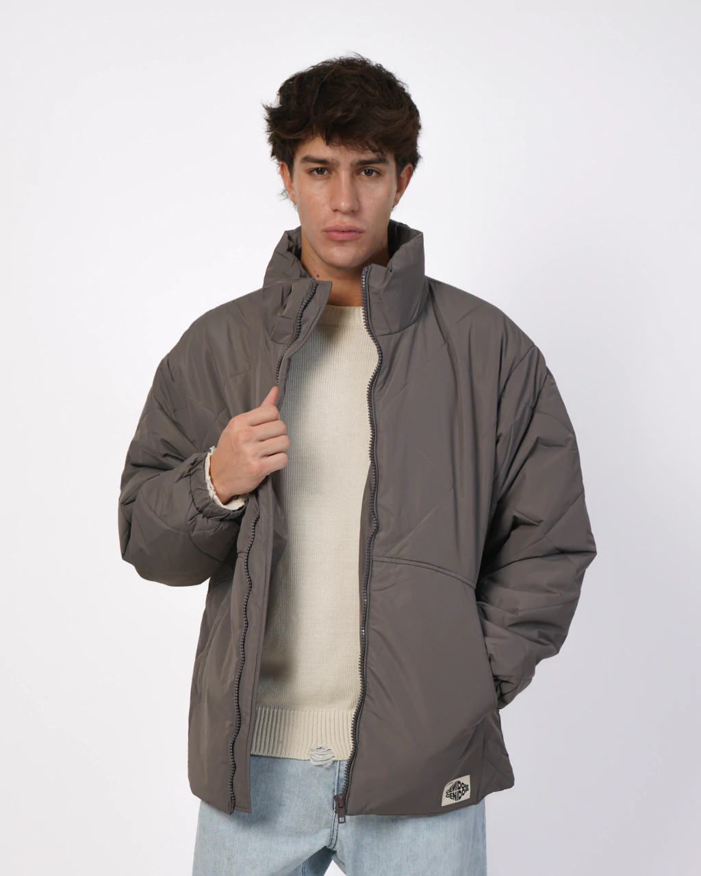Campera puffer oversize metalaseada color visón con recortes y detalles de máxima calidad. Entendés que hasta el cierre tiene grabado el oso de Ceni? Otro nivel.